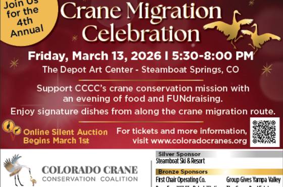 Please join us for a memorable evening celebrating the return of the Greater Sandhill Cranes to Northwest Colorado, while raising funds to support CCCC's vital conservation work.
